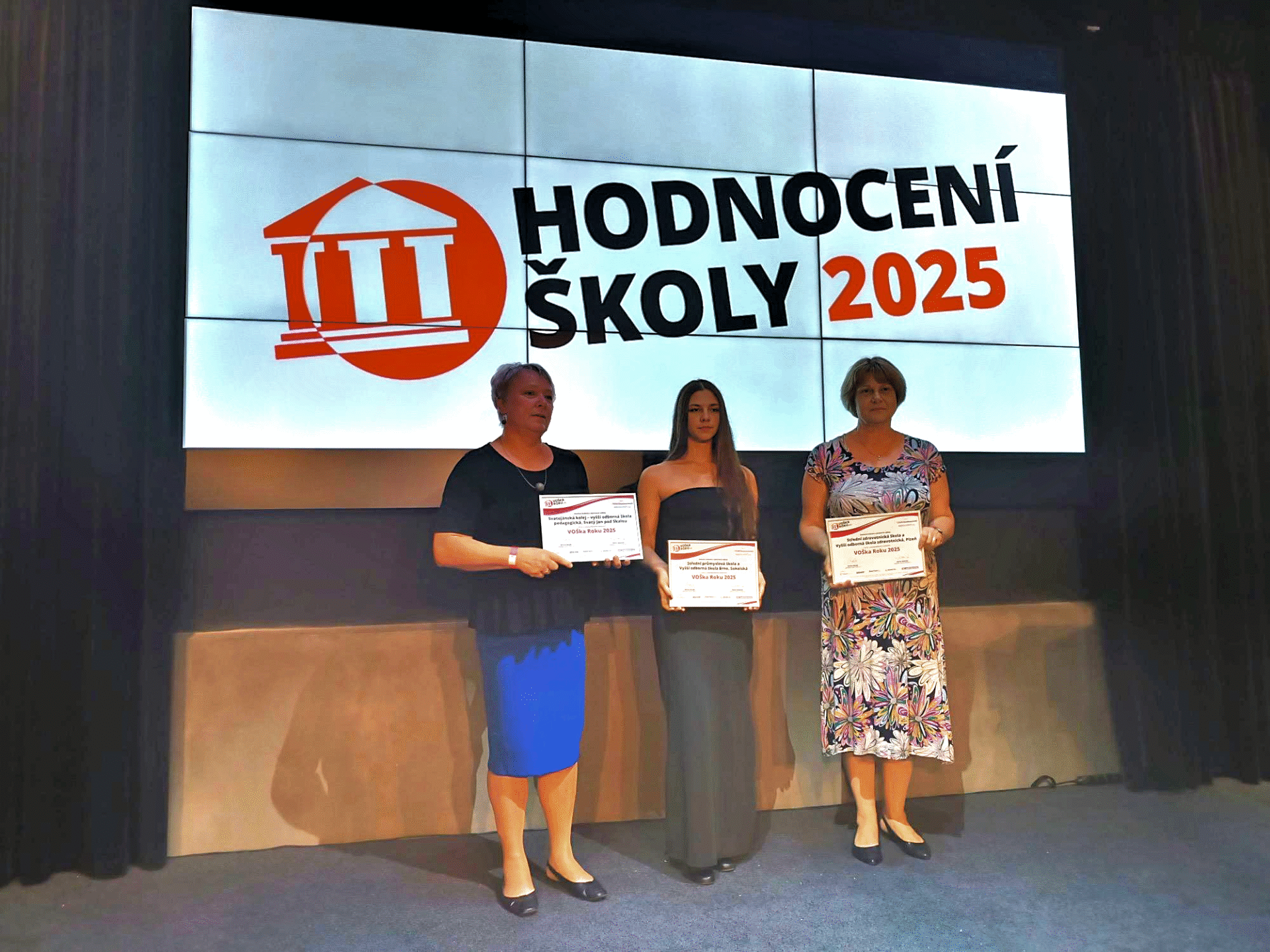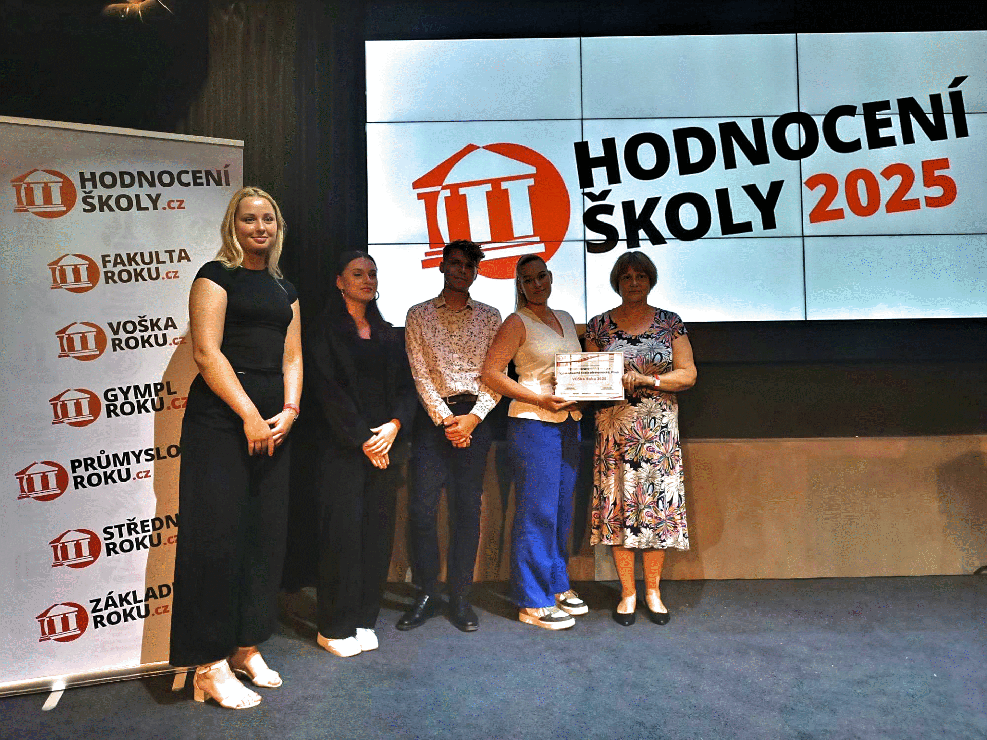 V úterý 24. června se zástupci naší školy zúčastnili v Praze slavnostního vyhlášení a předání ocenění VOŠka roku 2025, kde jsme získali krásné 3. místo v letošním celorepublikovém hodnocení. Tento titul uděluje Asociace studentů a absolventů v šesti kategoriích. Akce proběhla ve slavnostních prostorách Smíchovské SPŠ a gymnázia a za naši školu se jej zúčastnila Mgr. Ivana Černá spolu se čtyřmi studenty prvních ročníků VOŠZ.